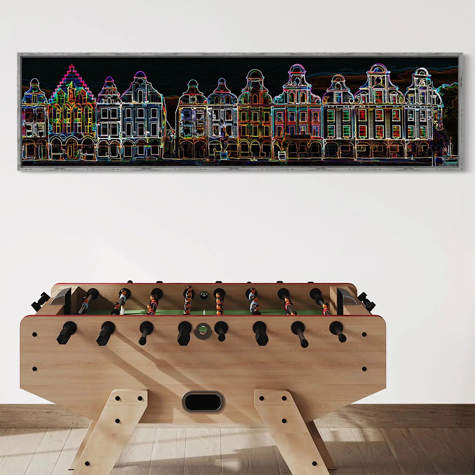 Au départ d'une photographie des façades de la grand-place, côté hôtel des 3 Luppars, elle a été transformée graphiquement en version fond noir et lignes des bâtiments en traits colorés.