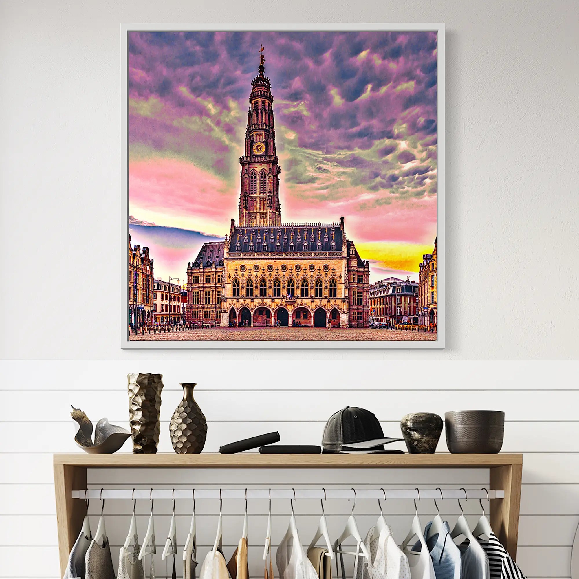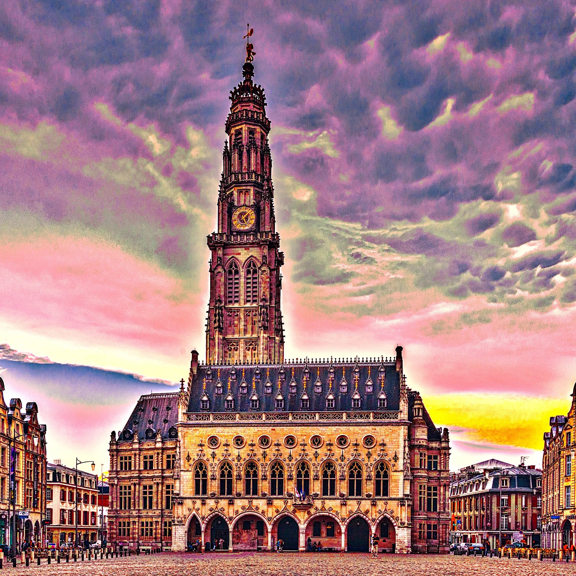 Le rose étant très à la mode, nous avons réalisé cette version du beffroi d'Arras sous un ciel nuageux.