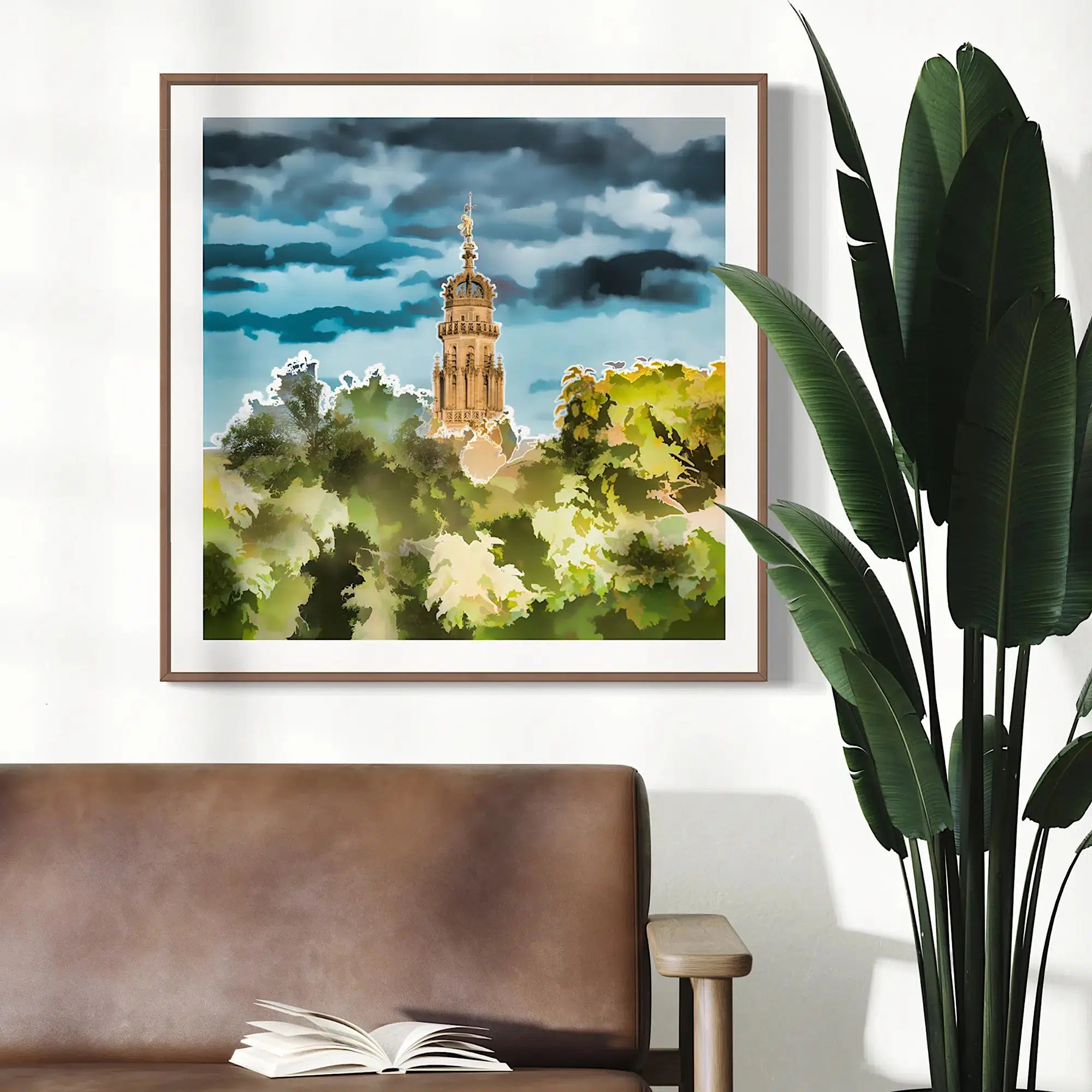 Au détour d'une rue, d'un jardin, voici le Beffroi d'Arras photographié de jour, dont la pointe émerge parmi la cîme des arbres.