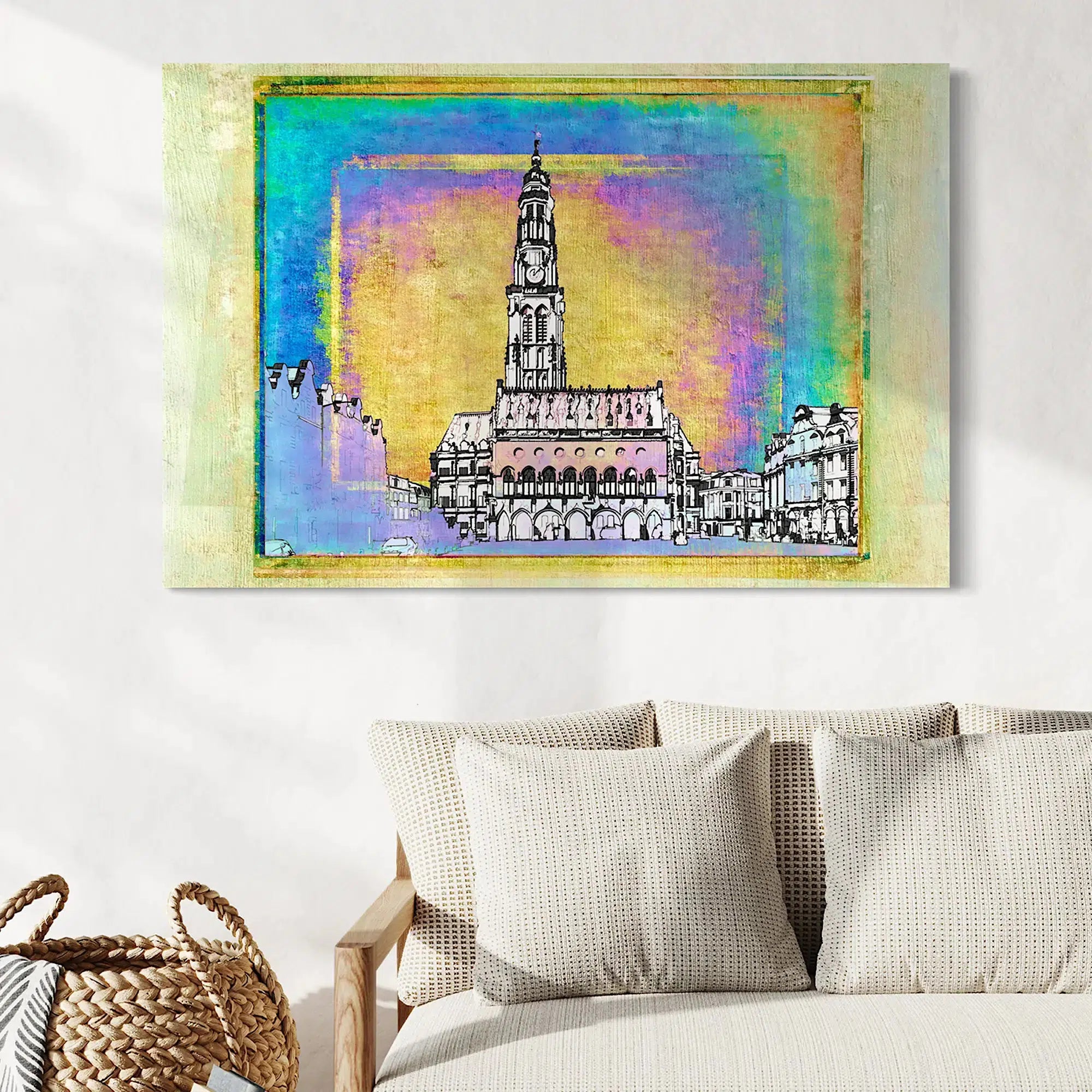 Collages sur le thème du beffroi d'Arras, dans les teintes bleues et vertes. Cette superbe réalisation, au départ d'une photo originale de Jacques Goffin sera du plus bel effet dans votre intérieur.