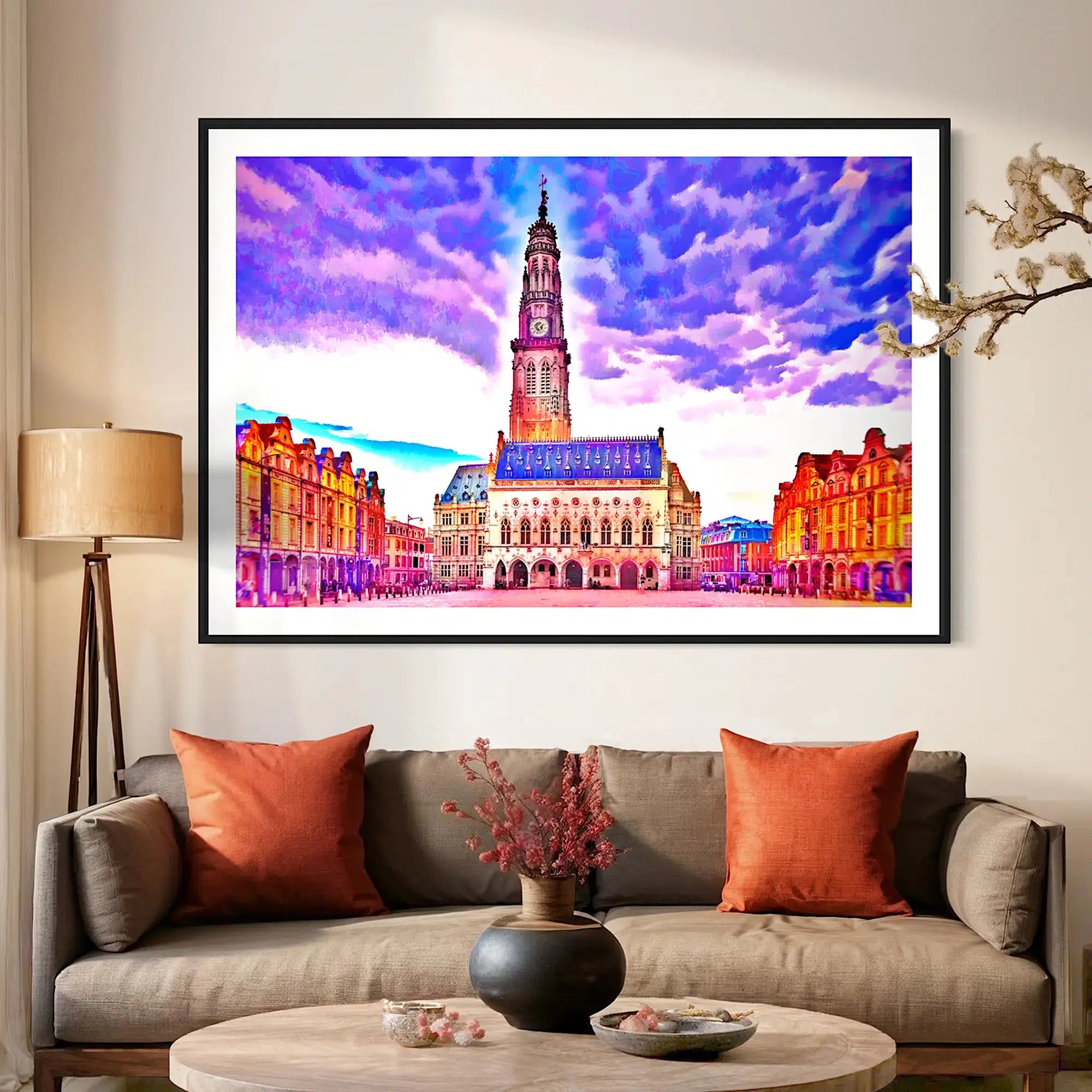 Le Beffroi d'Arras, de jour, sous un ciel nuageux en version rose.
