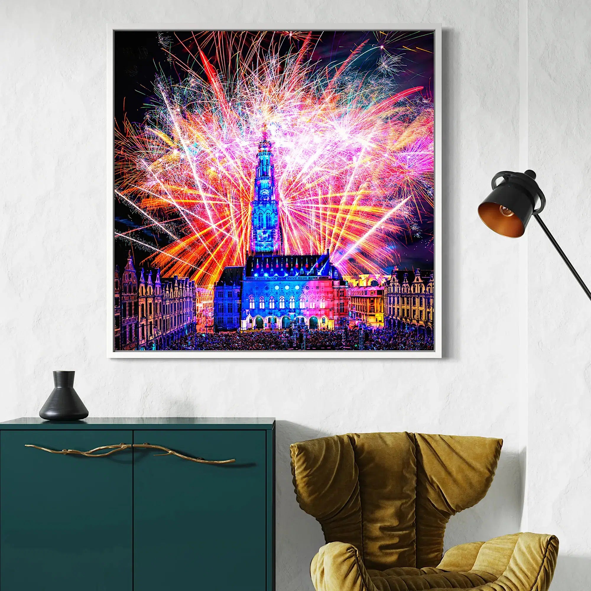 Photographié lors de l'embrasement du Beffroi d'Arras, sur fond de feux d'artifice, on peut sentir l'odeur de la poudre simplement en regardant la photo.
