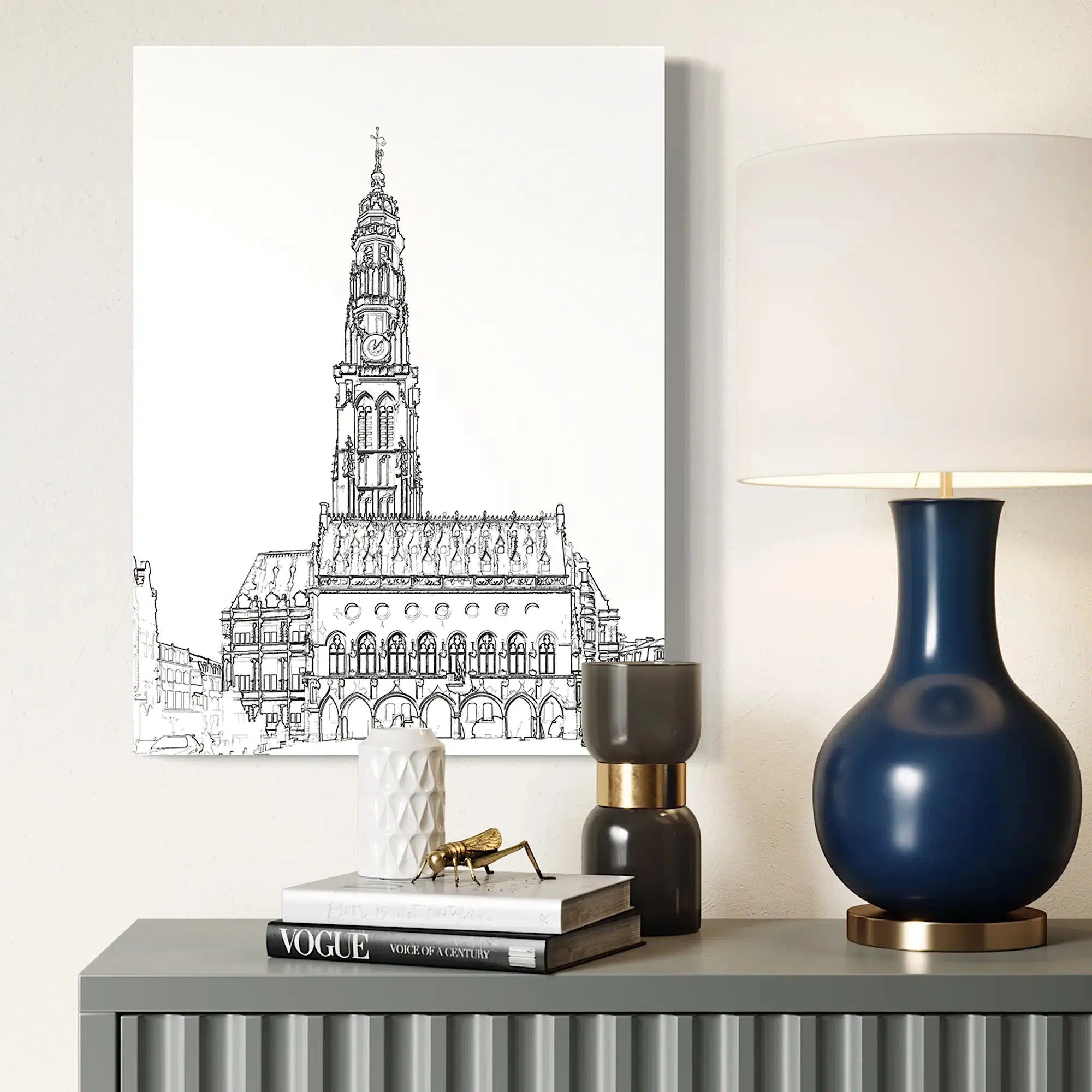 Une décoration inédite. Pour votre intérieur, voici Le Beffroi d'Arras façon trait Noir et blanc, en format vertical.