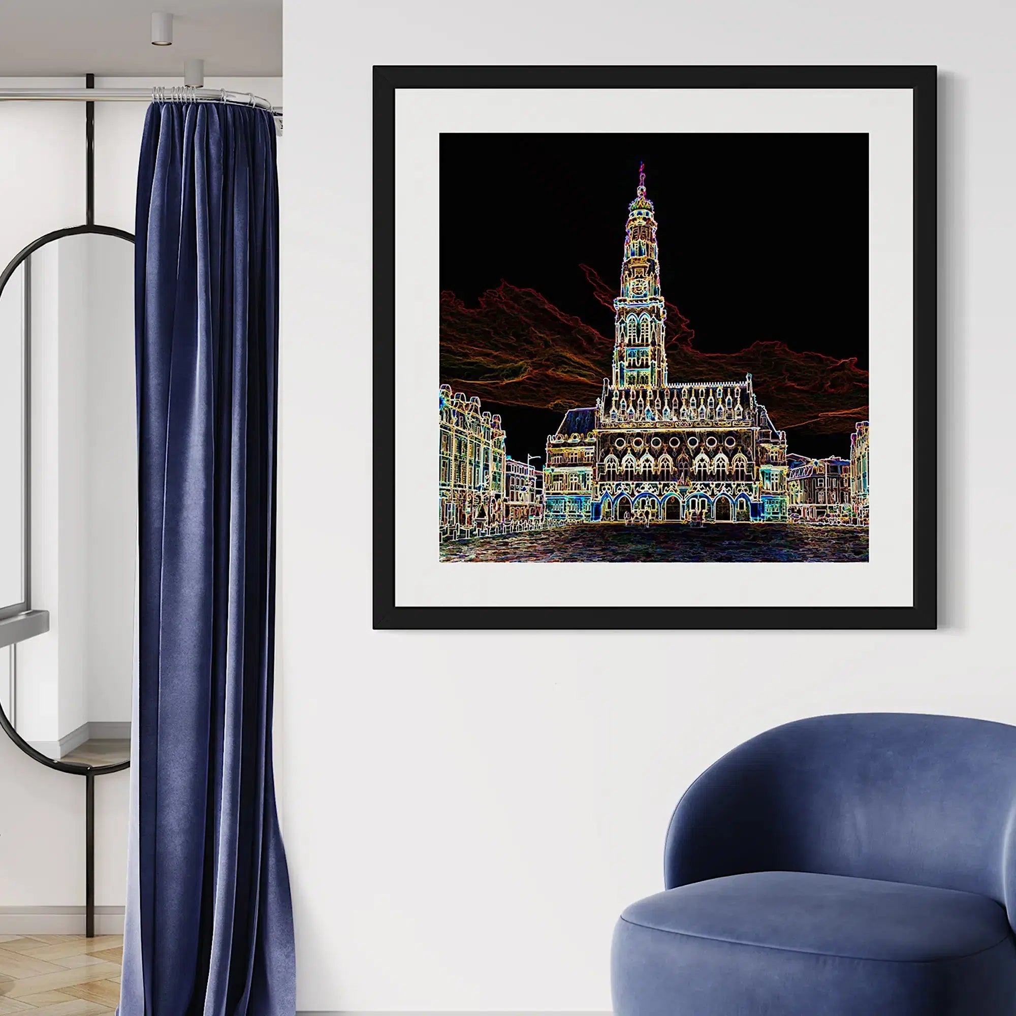 Au départ d'une photographie originale de Jacques Goffin, celui-ci a donné du mystère au Beffroi d'Arras en transformant les couleurs, lignes, teintes afin d'obtenir un résultat extraordinaire et presque irréel.