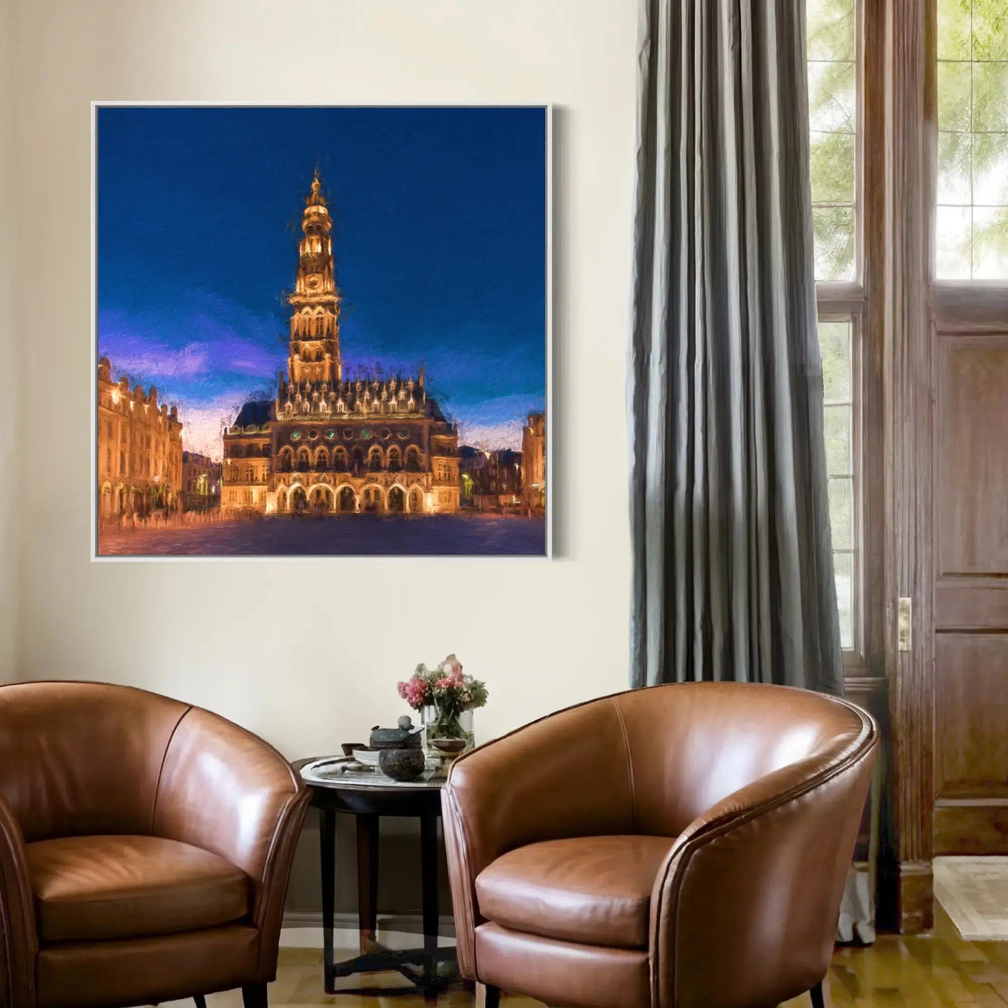 Photographie retravaillée et transformée à la manière du célèbre peintre Turner, le Beffroi d'Arras, sous un ciel bleu au coucher de soleil.
