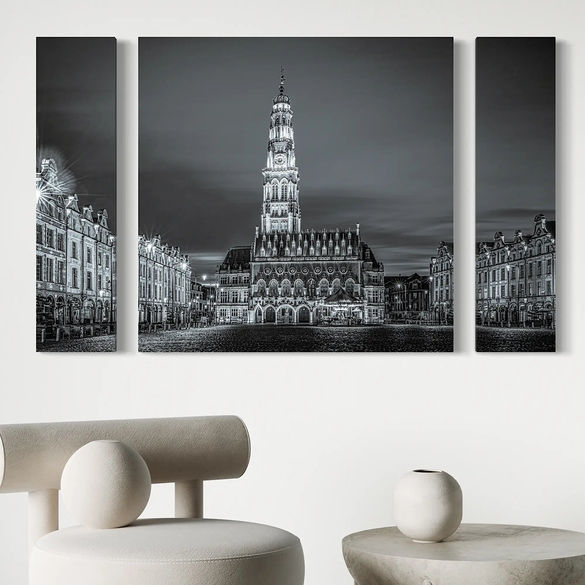 Le beffroi d'Arras et son manège. Triptyque en noir et blanc.