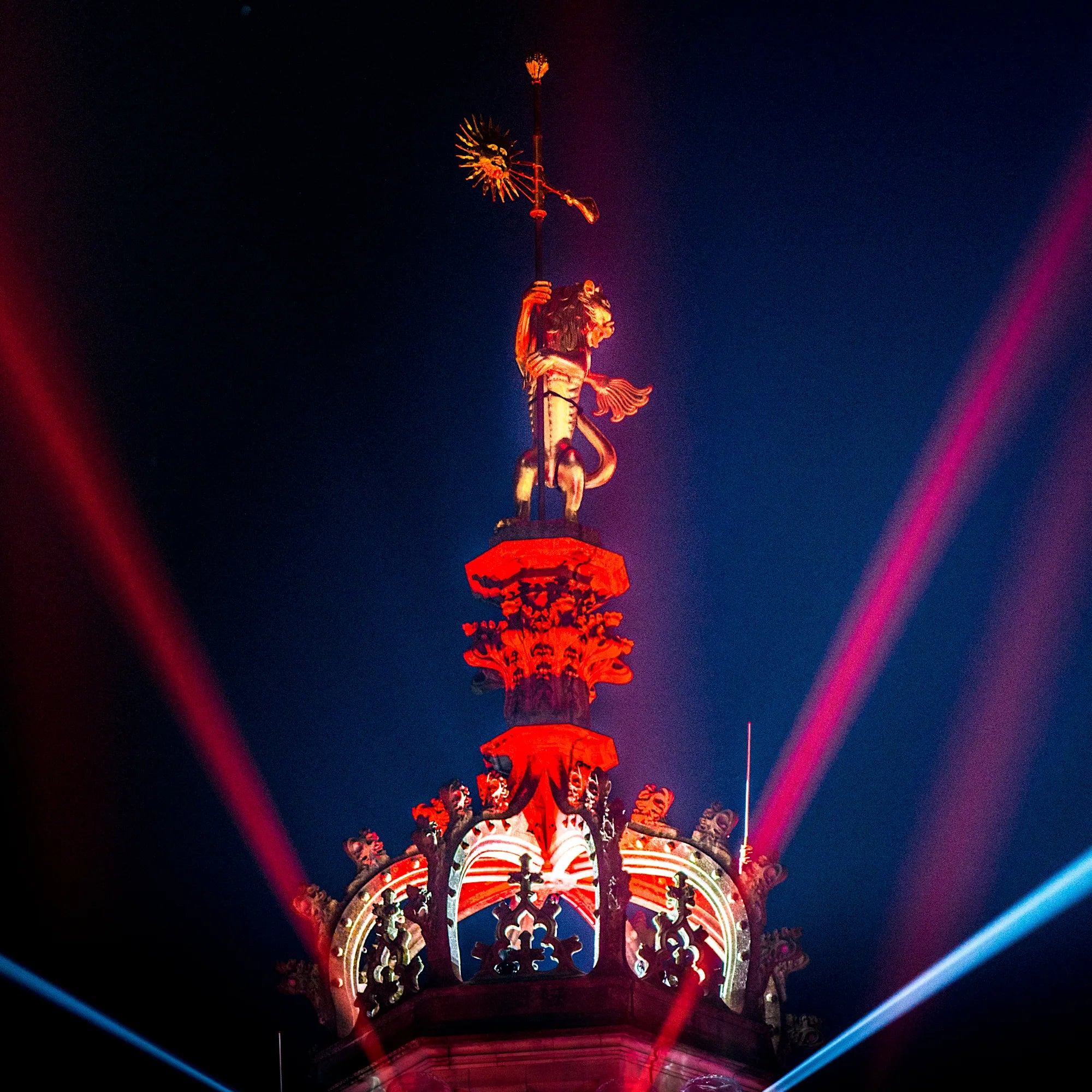 Une photographie particulièrement réussie du lion trônant fièrement au dessus du beffroi d'Arras. Les traits lumineux donnent de la majesté à cette photo prise par Jacques Goffin.