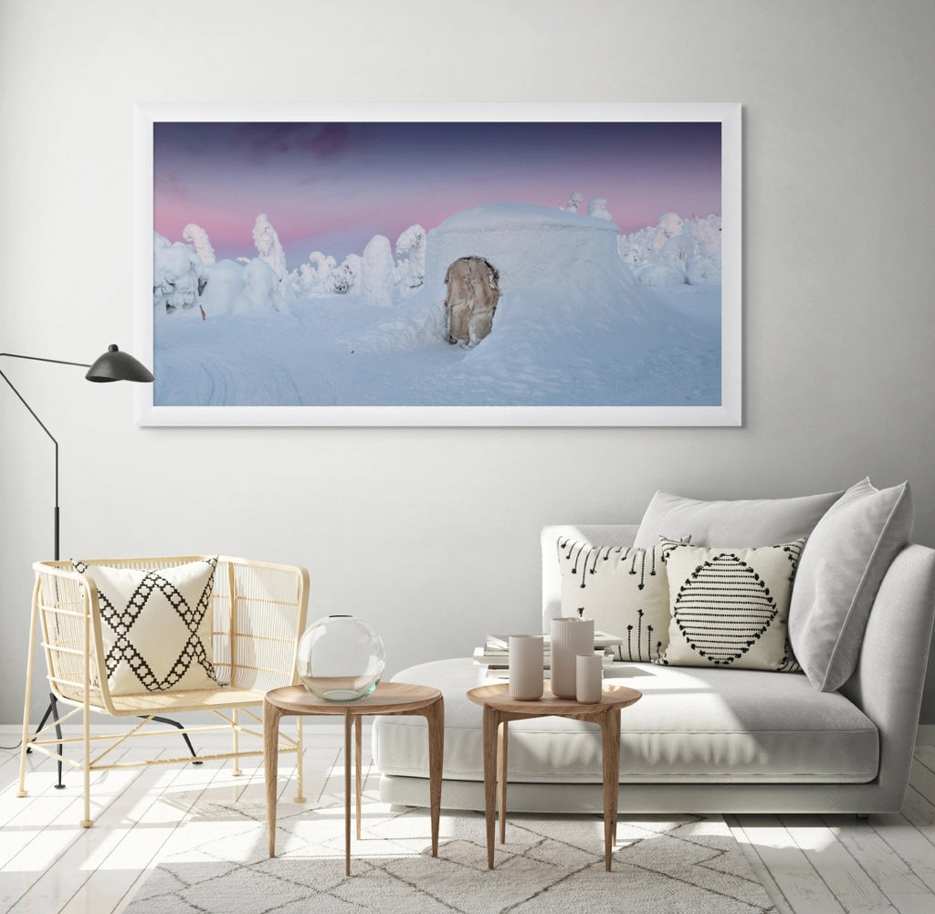 Plongez dans l’univers féerique de la Laponie finlandaise avec cette photographie d’une yourte enneigée, nichée au cœur d’un paysage hivernal à couper le souffle. Sous un ciel pastel teinté de rose et de violet, la structure recouverte de neige semble fusionner avec son environnement glacé, offrant une scène empreinte de sérénité et de magie arctique.