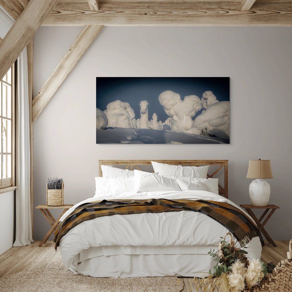 Chaque structure semble raconter sa propre histoire, évoquant des créatures figées par l’hiver, transformant ce paysage en une galerie d’art naturel. La lumière douce met en valeur la texture du givre, révélant des détails subtils et une profondeur envoûtante. Idéale pour une décoration murale originale et immersive.