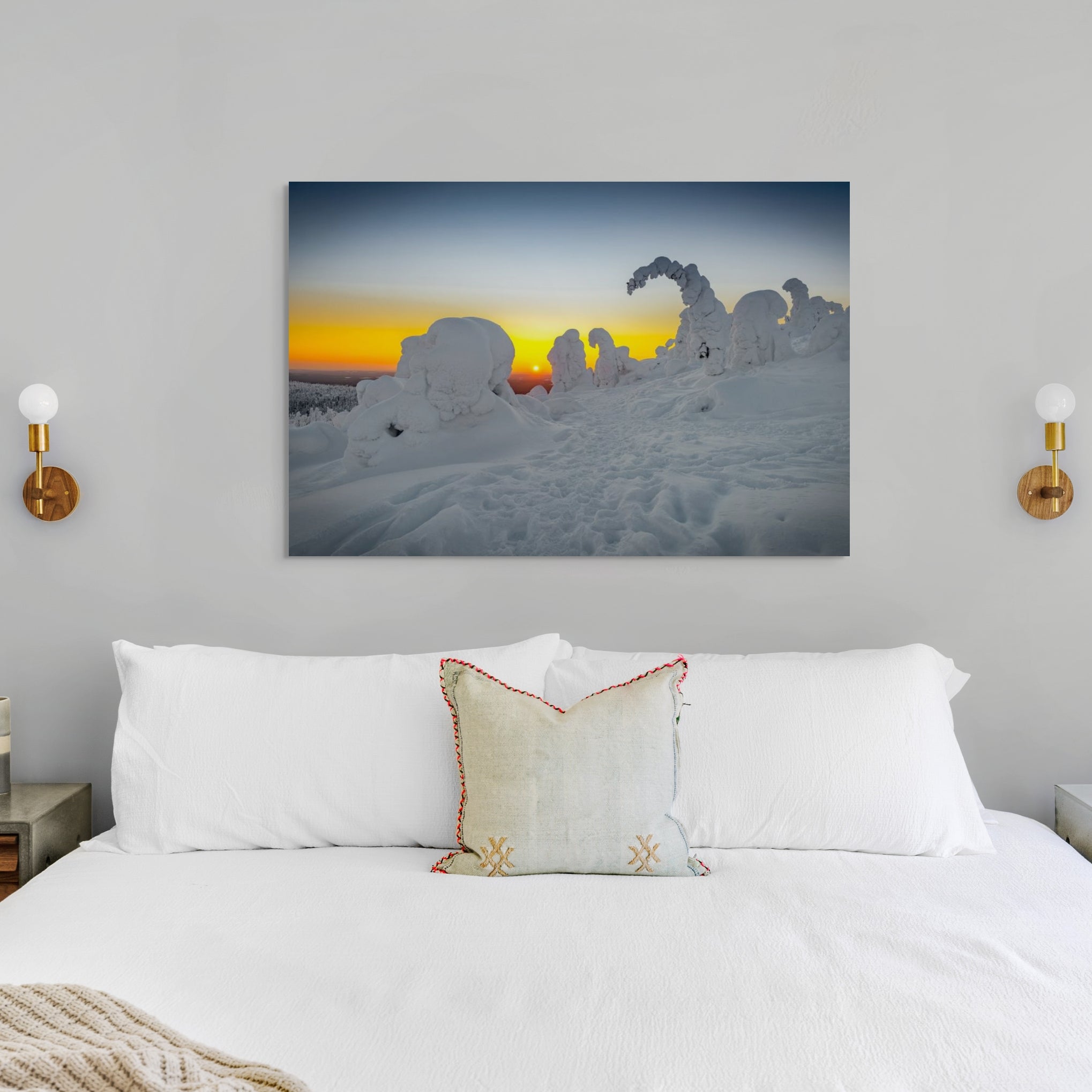 Un matin en Finlande, le lever du soleil, visible entre les créatures étranges formées par les arbres recouverts de neige.
