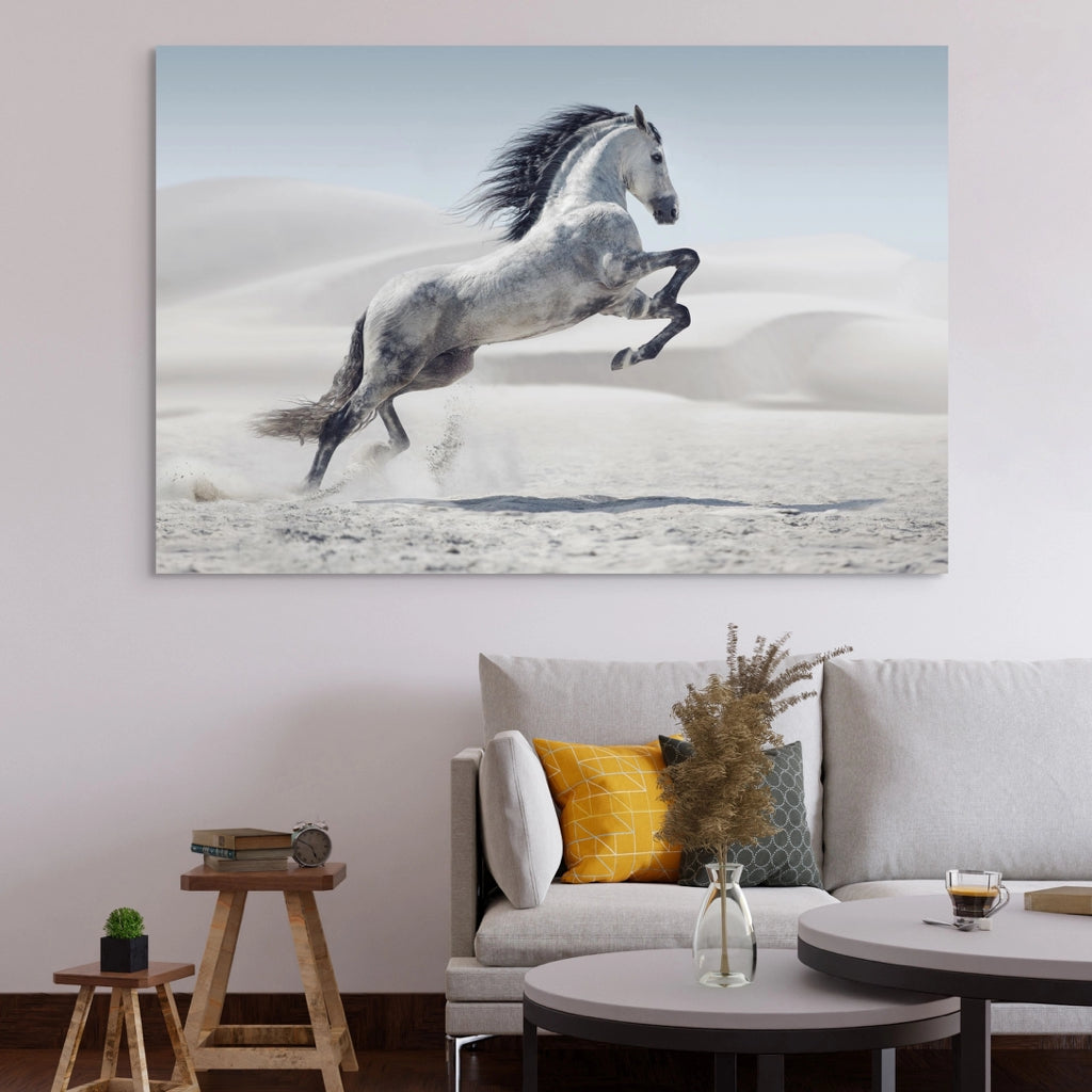 Ce superbe pur-sang blanc se distingue par son élégance, sa crinière majestueuse et sa capacité à sauter et même se cabrer sur deux pattes arrières.