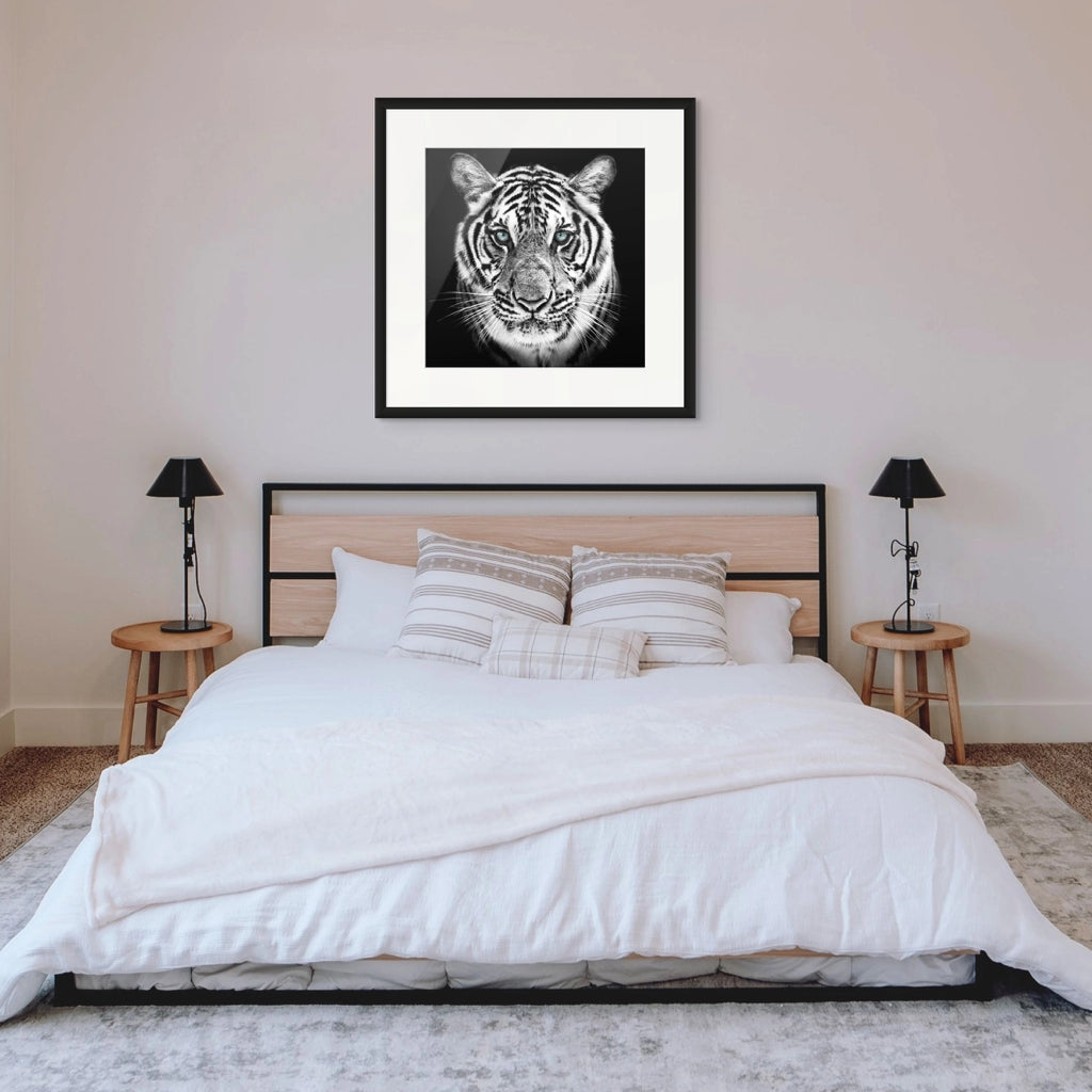 Célébrez la beauté majestueuse du tigre aux yeux bleus avec cette superbe photographie en noir et blanc.