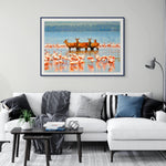 Discover the beauty of nature with our herd of antelopes surrounded by peaceful flamingos. Observe them coexisting in this blue lake.