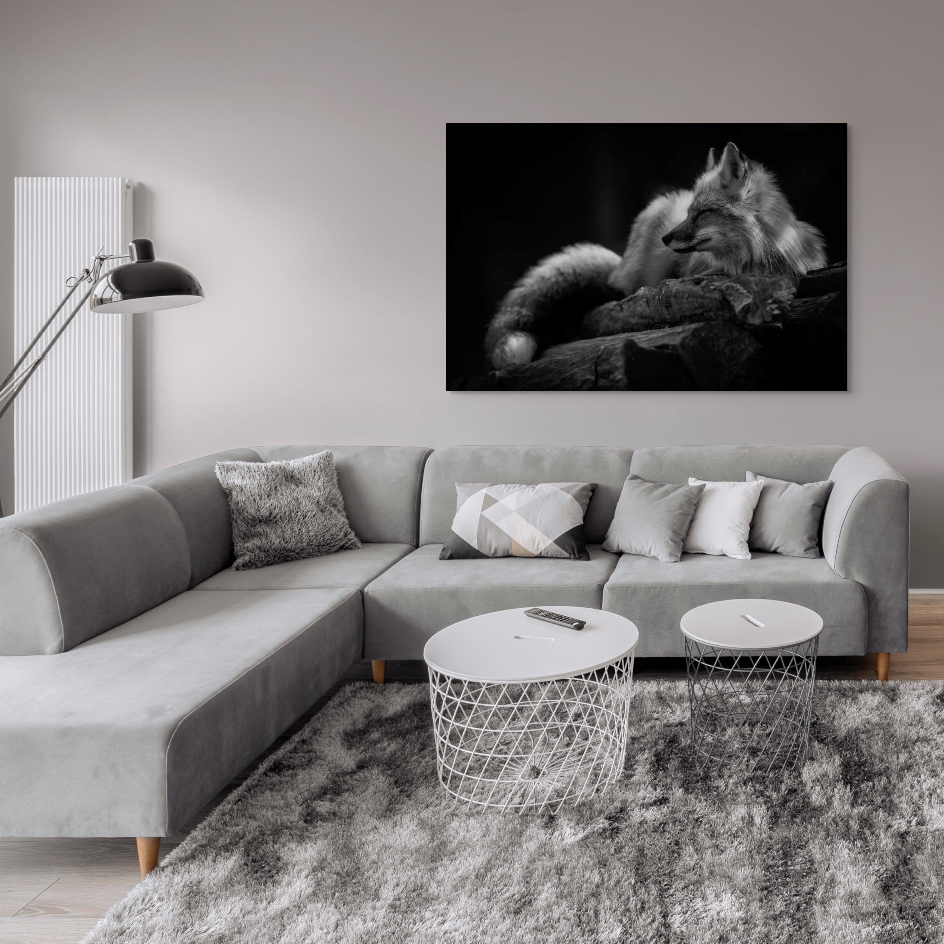 Capture the beauty of nature with this stunning black and white photograph of a red fox lying down, pensive. Add a touch of tranquility and serenity to your decor with this magnificent portrait. A must-have for all nature and photography lovers.