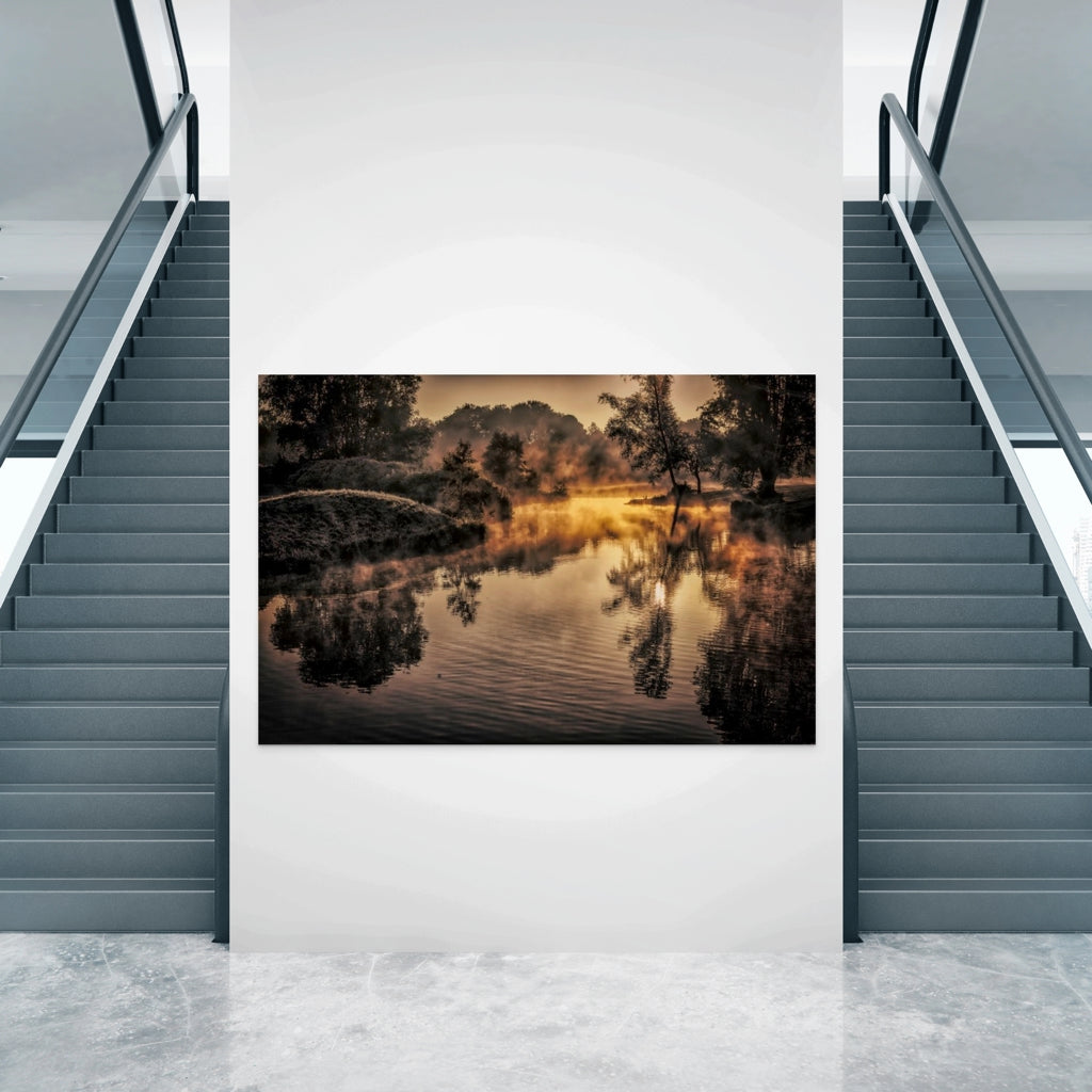 Jacques Goffin took this photograph of a pond surrounded by trees very early in the morning, as soon as the sun rose.