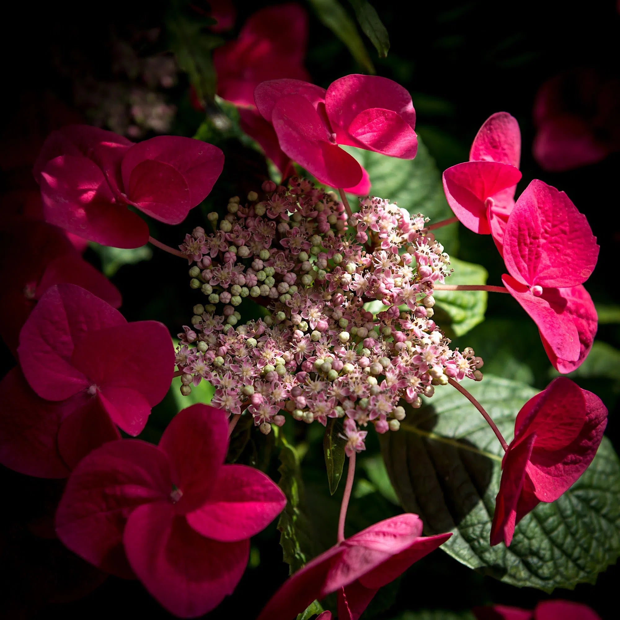 Hydrangeas, hydrangeas, are native to North America and Japan. Very rustic and deciduous, these are perennial plants that come in several colors, here, in red.