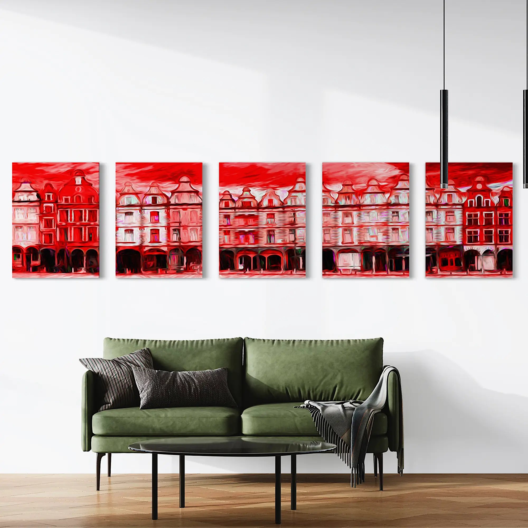 Discover a superb original work by Jacques Goffin reworked in Liquid Red! The panorama of Place des Héros comes to life in the form of five panels forming a panoramic view of the facades.