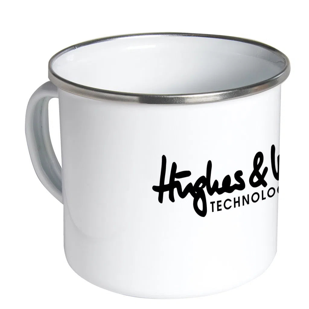 White enamel mug with aluminum rim.