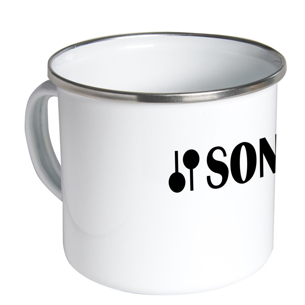 White enamel mug with aluminum rim.