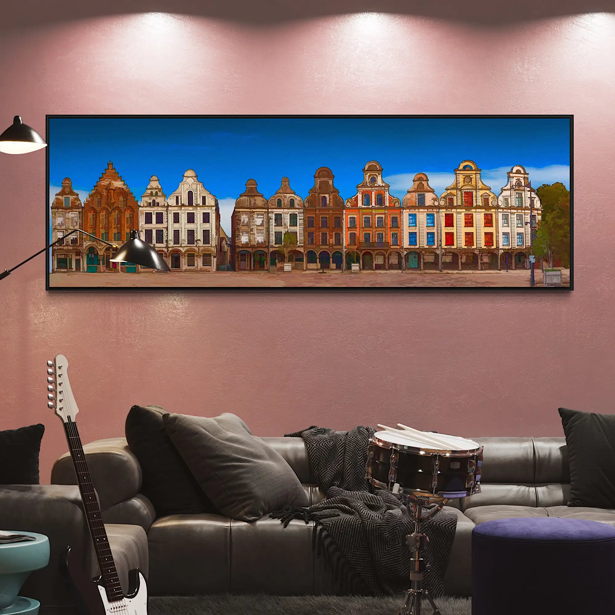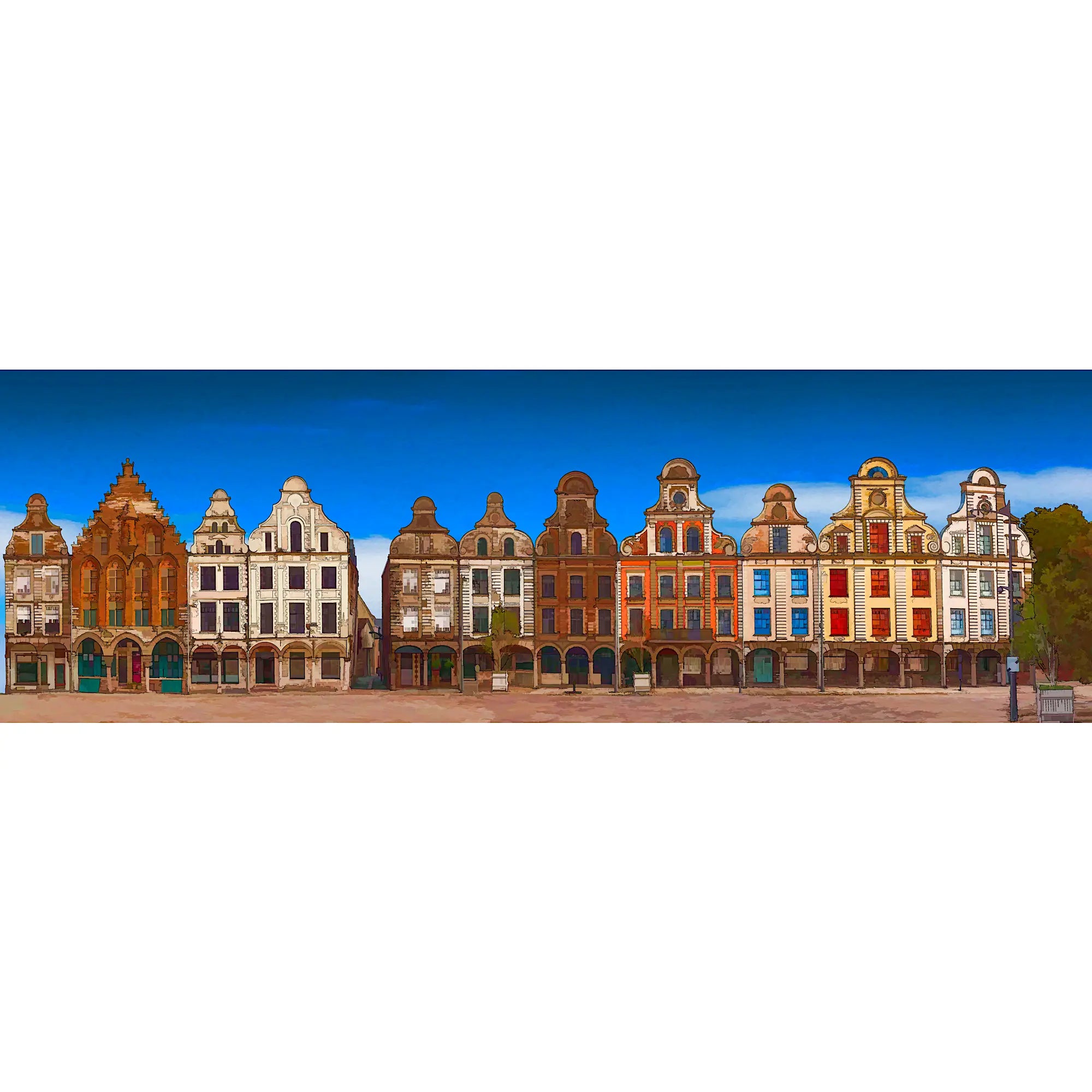 Starting with a photograph of the facades of the main square, on the Hôtel des 3 Luppars side, it was graphically transformed to offer you this version highlighting the colorful buildings.