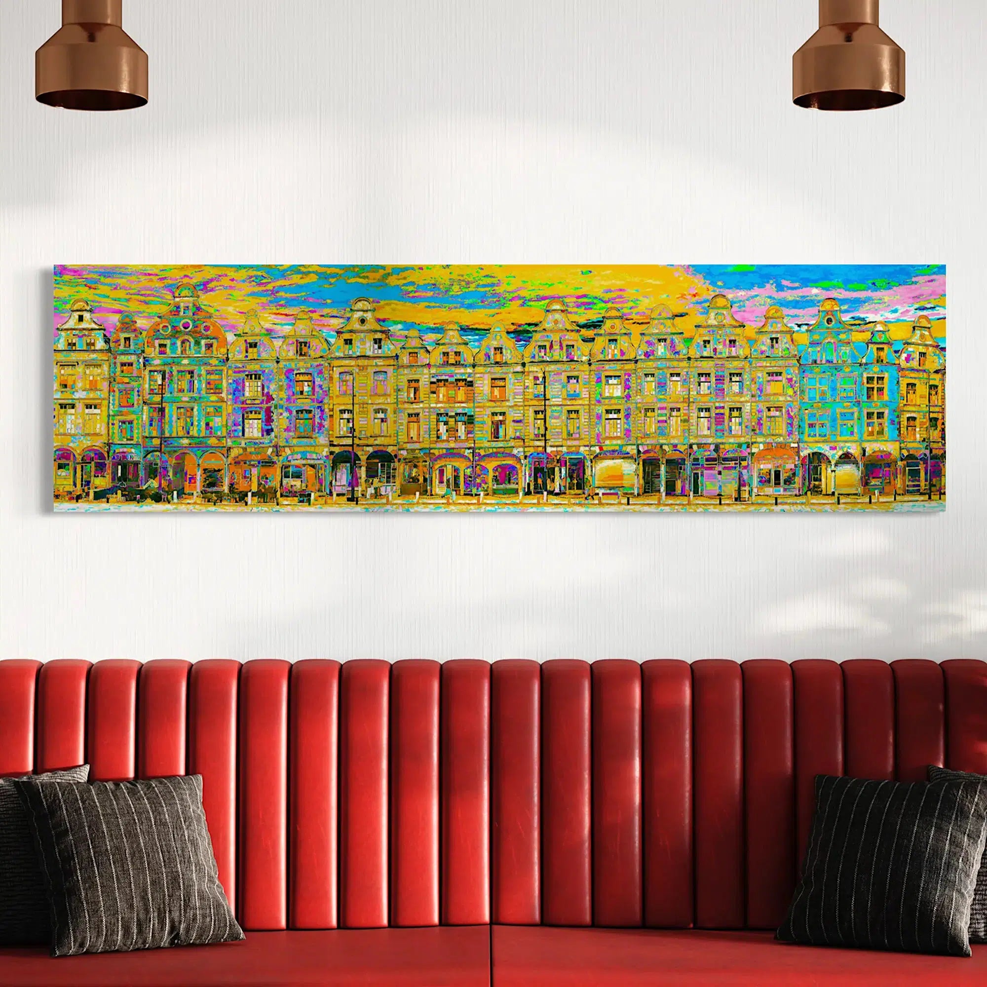 Panoramic of the facades of the Place des Héros in Arras , psychedelic yellow version.
