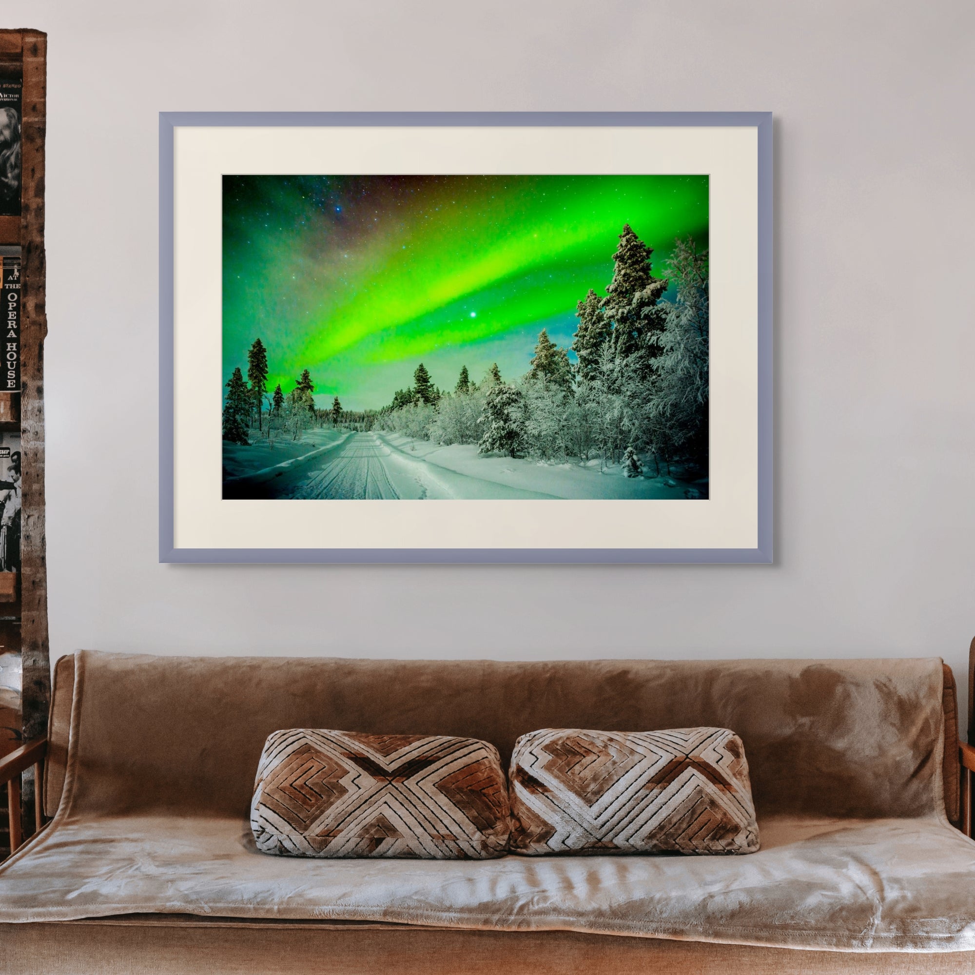 Admire this magical atmosphere on the snowy road, with this photograph capturing a green aurora borealis which lights up the snow and the snow-covered fir trees. Let yourself be transported by the mysterious and green atmosphere of this winter scene.