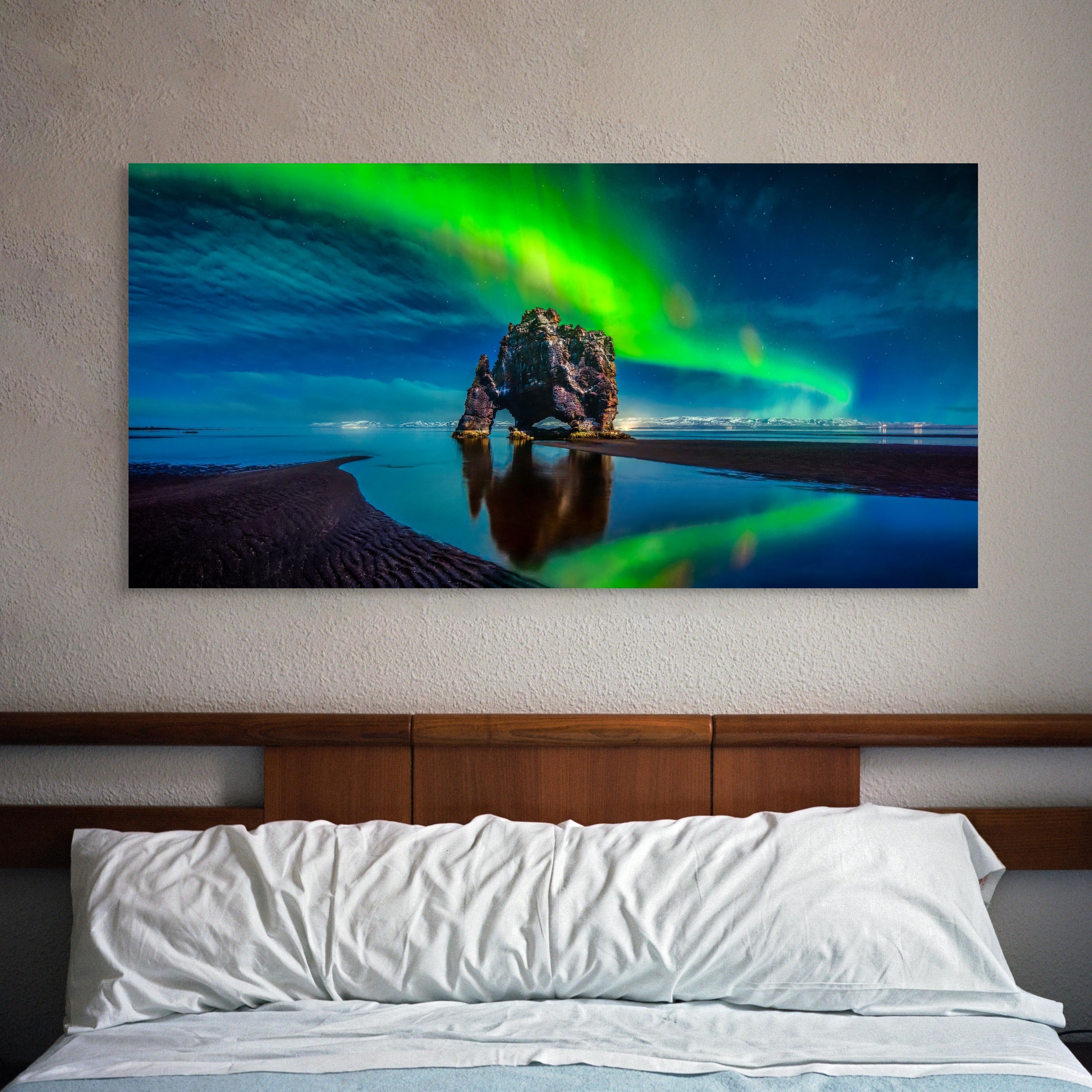 An original and exotic decoration with the captivating beauty of the Northern Lights in Hvitsekur in Iceland. This unique photograph highlights the Icelandic night with its midnight blue sky, beautiful black sand beaches and the ocean in the background. Don't miss the green Aurora Borealis dancing above the famous Hvitsekur Rock.