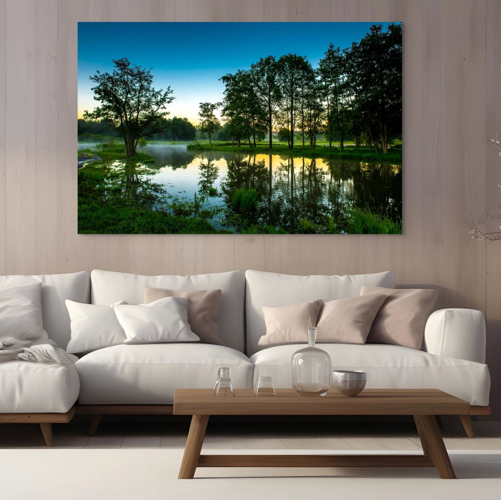 For the decoration of your interior, this relaxing photograph of a pond in the early morning.