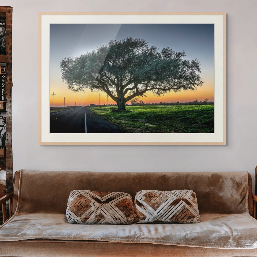 Enjoy a picturesque view with our Roadside Tree at dusk. Admire the sunset against a dark blue sky while discovering the stunning tree by the side of the road. A breathtaking scene that brings calm and serenity.