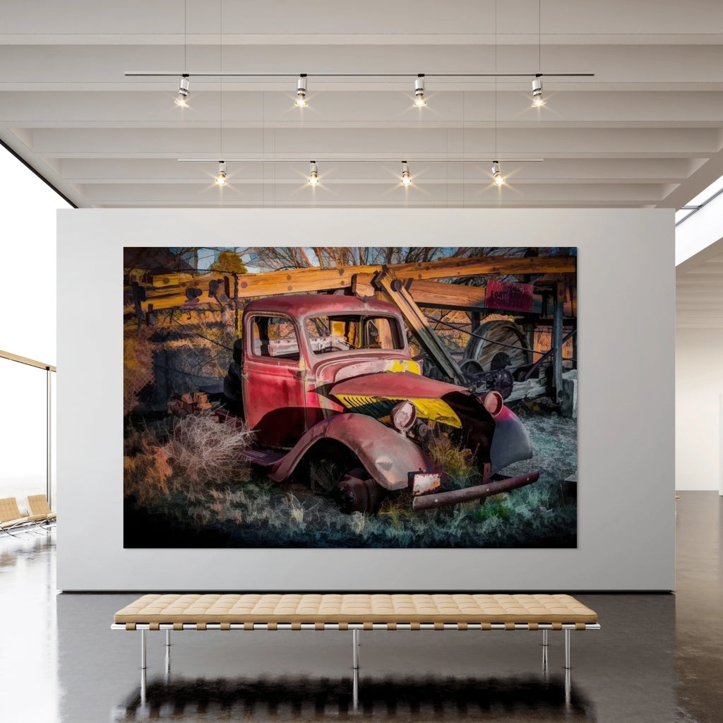 Son capot cabossé, marqué par des touches de jaune vif, contraste avec le rouge oxydé de la cabine. Autour de lui, des herbes sauvages et des éléments de mécanique agricole témoignent d’un passé industriel oublié. L’arrière-plan, composé de bois vieilli et de roues dentées, accentue l’atmosphère nostalgique et donne à l’image un charme unique. La lumière douce du crépuscule met en valeur chaque détail, soulignant les textures et les ombres de ce véhicule d’époque. Idéale pour les amateurs de photographie vintage, de véhicules de collection et de paysages rétro, cette œuvre apportera une touche d’authenticité et de caractère à toute décoration murale.