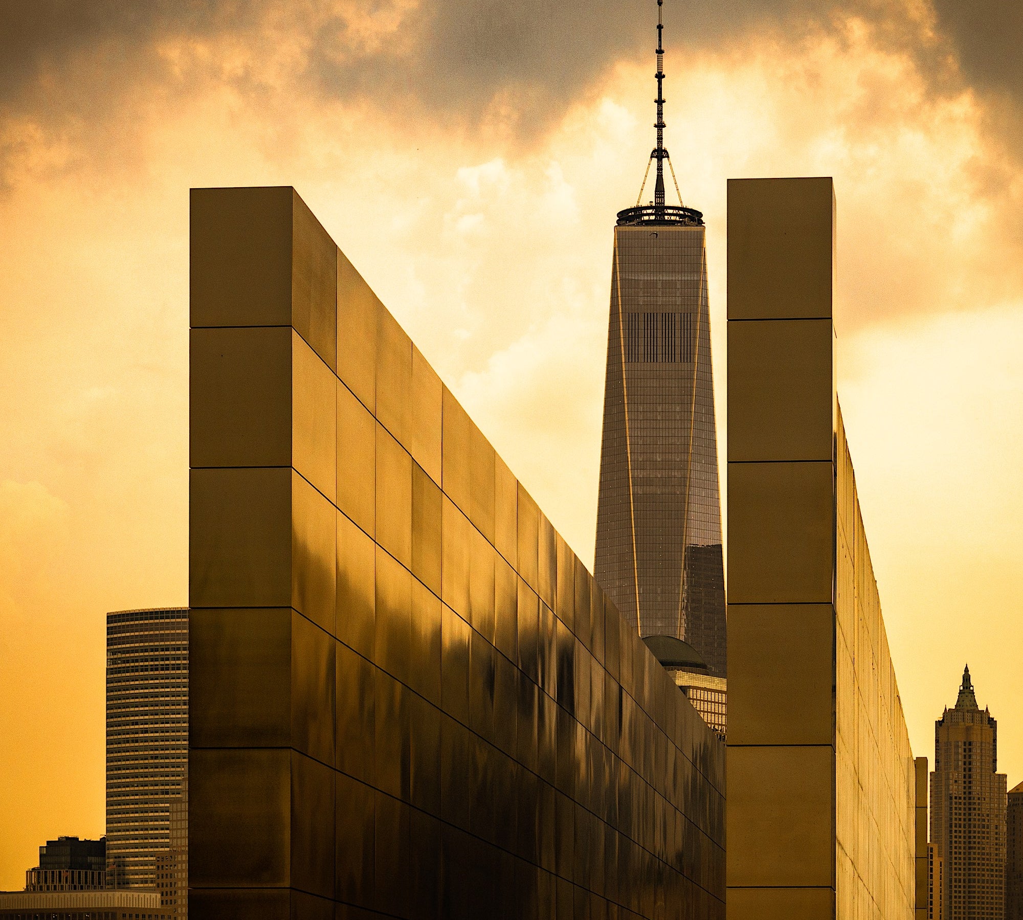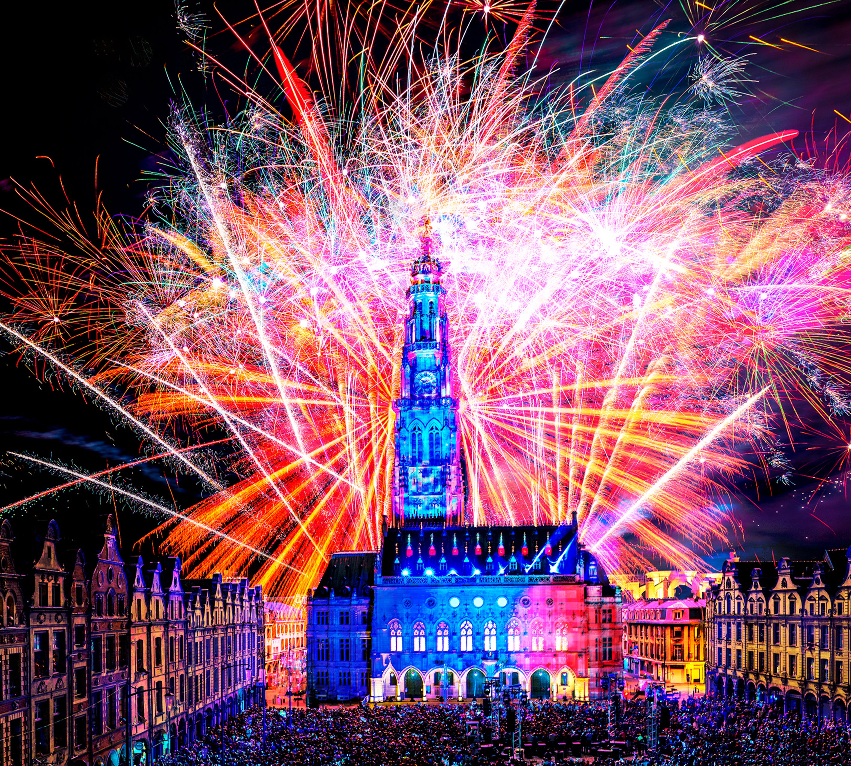 Panoramique du beffroi d'Arras et des façades de la place des Héros, photographié par Jacques Goffin à la tombée du jour.